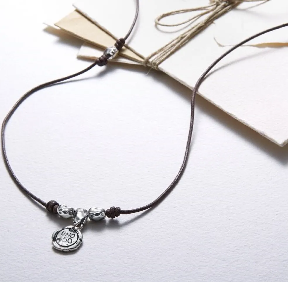 Ett enkelt men snyggt läderhalsband från varumärket Uno de 50. Halskedjan är hela 89 cm lång och kan faktiskt viras flera varv runt din handled om du istället vill använda smycket som armband.